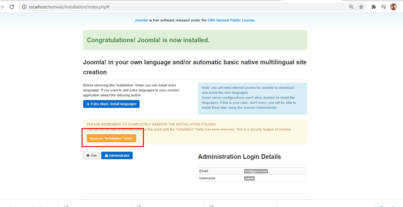 Ini adalah langkah yang terakhir, di mana anda hanya perlu tekan butang Remove "Installation Folder" . dan tahniah, anda telah mempunyai sebuah laman web dari platform Joomla.